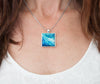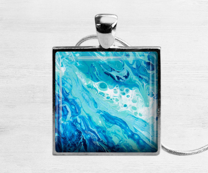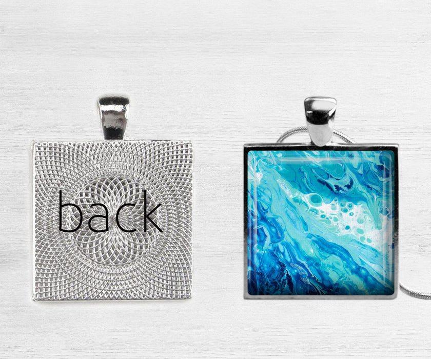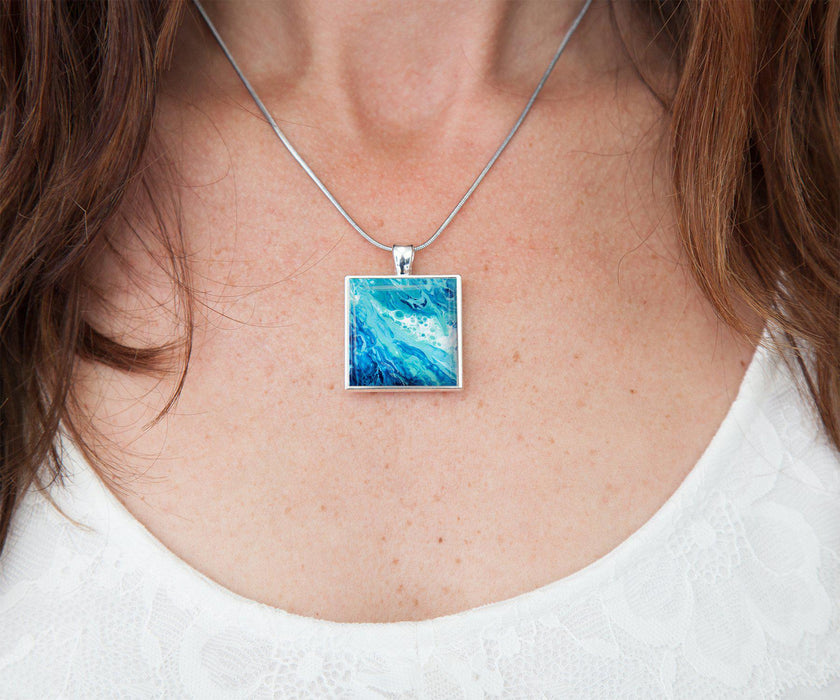 Artwork inside of necklace is an original piece of art created by Beach Blossom Studio and is designed to inspire you like a trip to your favorite beach. Coastal Breeze Square Necklace is an abstract painting inspired by the ocean waves.  Make a statement with this beautiful piece of wearable art from our Coastal Breeze collection and click here to shop the full line of jewelry in this collection.