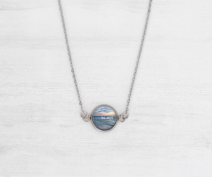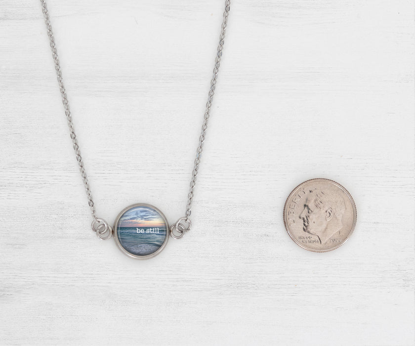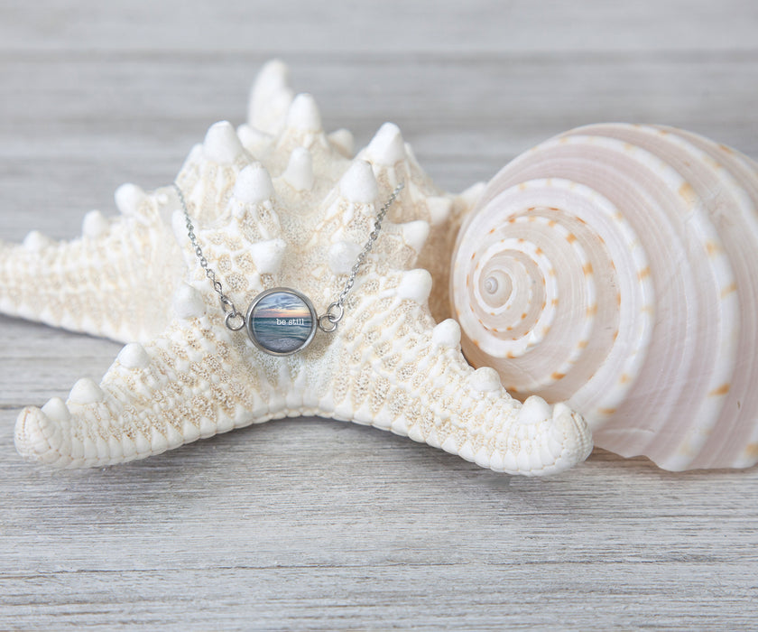 Artwork inside of necklace is an original piece of art created by Beach Blossom Studio and is designed to inspire you like a trip to your favorite beach. Make a statement with this beautiful piece of wearable art. If you love this motif, click here to shop the whole Be Still collection!