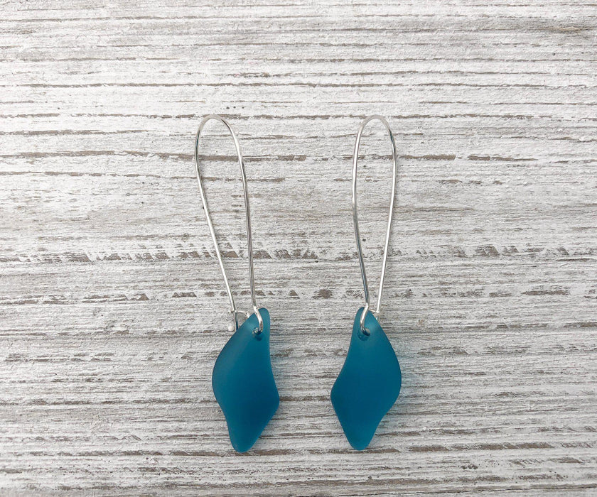 The Teal Sea Glass Wave Long Dangle Earrings feature beautiful teal cultured sea glass in wave shape earrings, created to inspire you like a trip to your favorite beach.  Make a statement with this beautiful piece of sea glass jewelry from our Sea Glass collection and click here to shop the full line of jewelry in this collection.