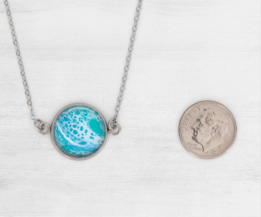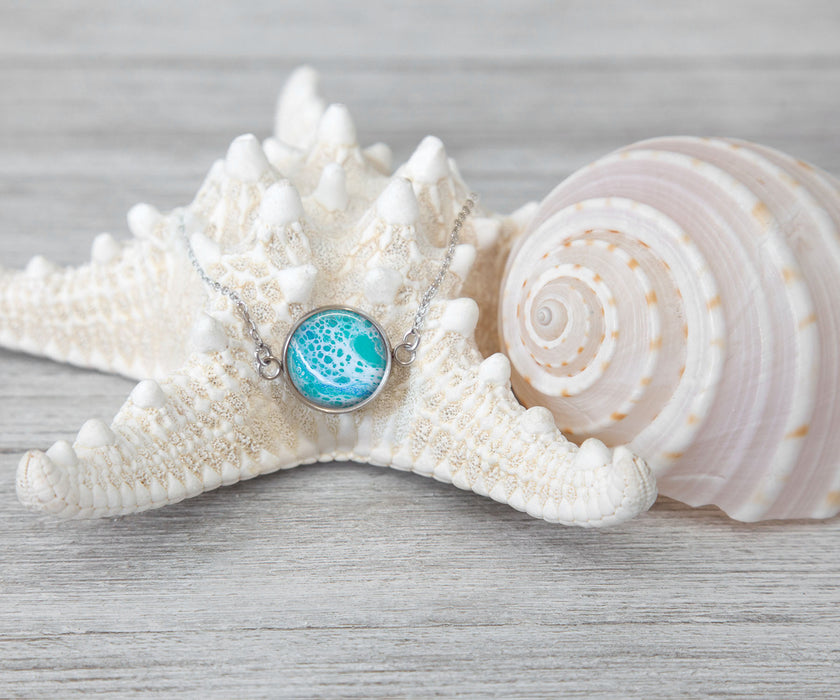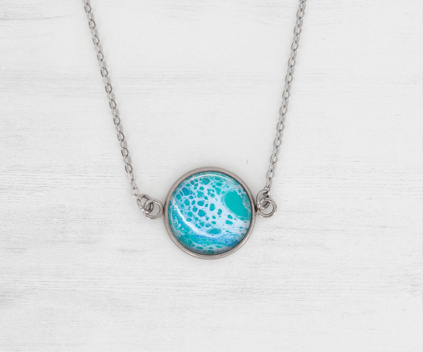 Artwork inside of necklace is an original piece of art created by Beach Blossom Studio and is designed to inspire you like a trip to your favorite beach. Make a statement with this beautiful piece of wearable art. The Tranquil Waters Necklace is an abstract painting inspired by the ocean waves. Click here to shop our full line of jewelry in this collection.