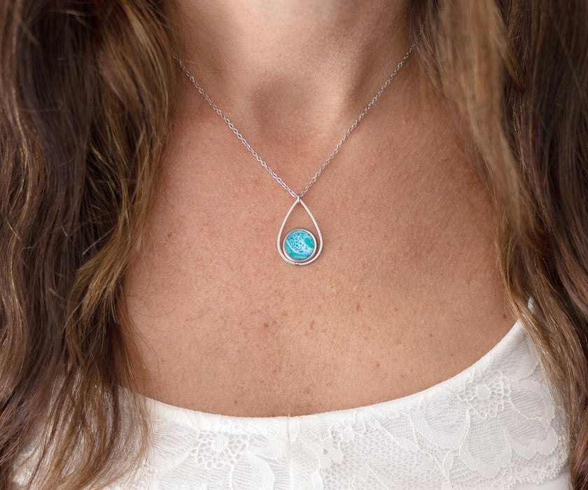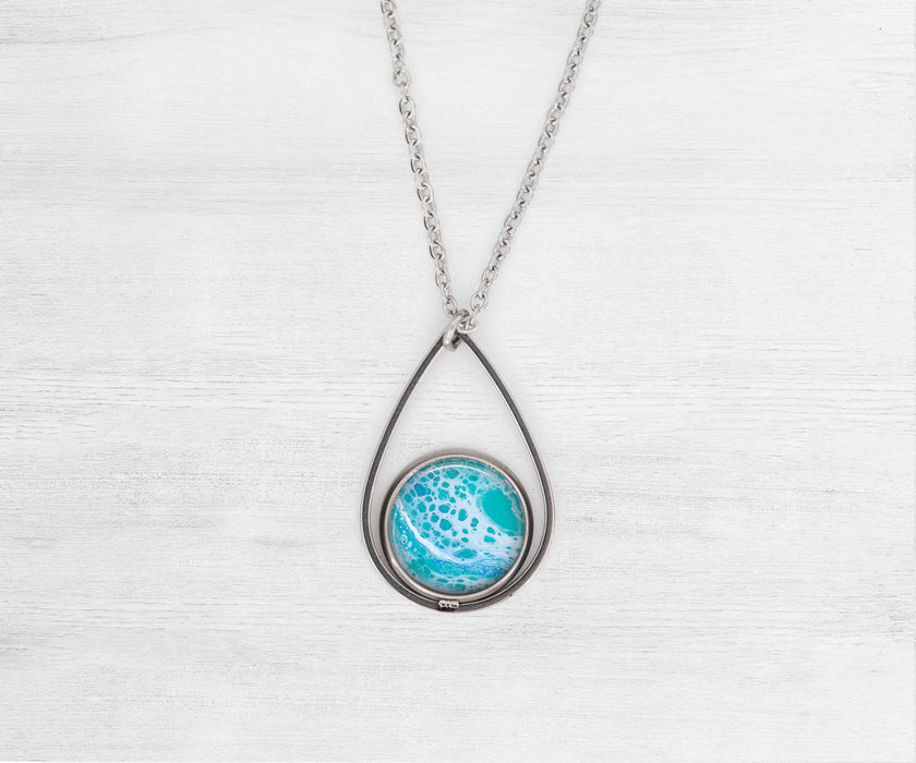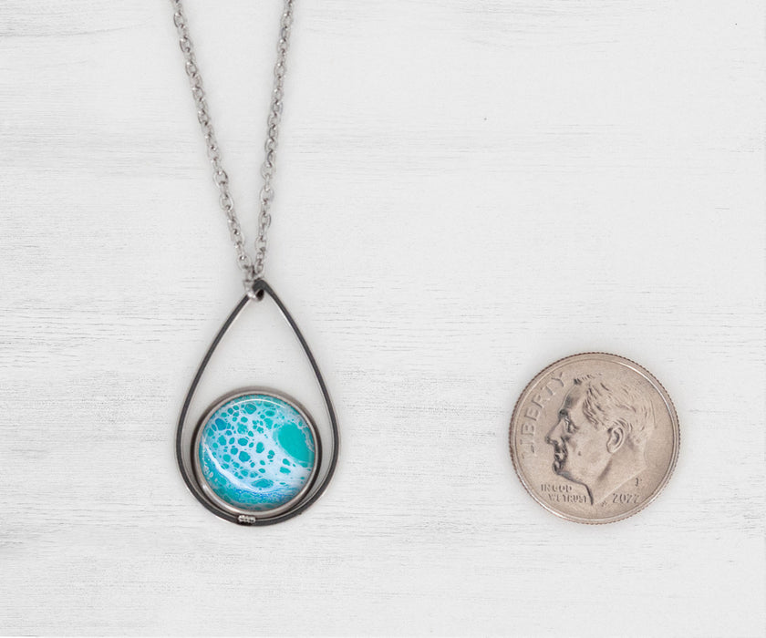 Artwork inside of necklace is an original piece of art created by Beach Blossom Studio and is designed to inspire you like a trip to your favorite beach. Make a statement with this beautiful piece of wearable art. The Tranquil Waters Necklace is an abstract painting inspired by the ocean waves. Click here to shop our full line of jewelry in this collection.